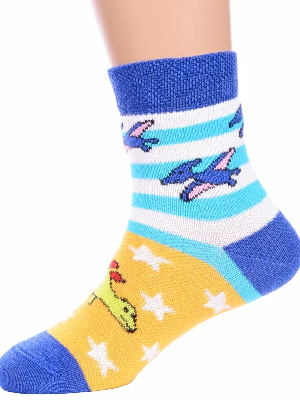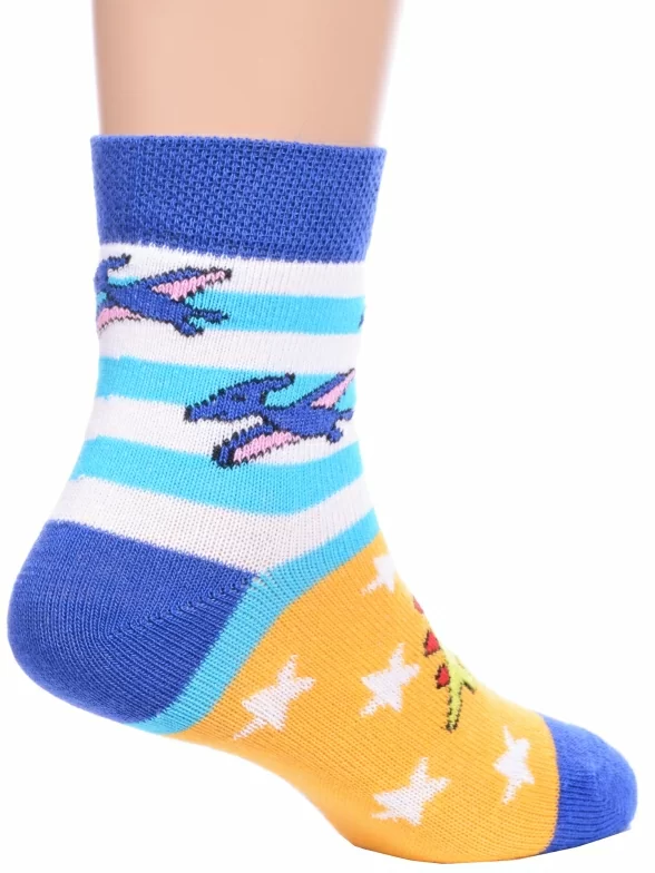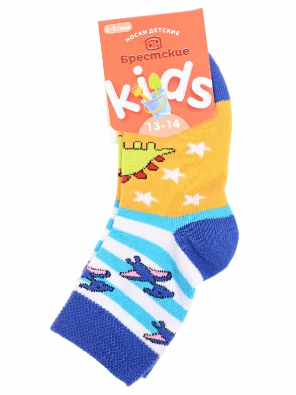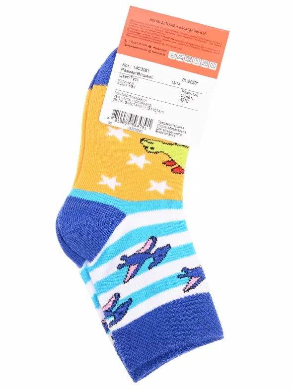 Круглогодичные укороченные детские носки, цвет синий, повседневные, возможно бесшовные, принт (рисунок): полоски, контрастные пятка / мысок / резинка, звезды / небо, животные, с узором, состав: 75% хлопок, 23% полиамид, 2% эластан, арт. 14С3081. Производитель «Брестский чулочный комбинат ОАО, Беларусь» под брендом «Брестские (бчк)».