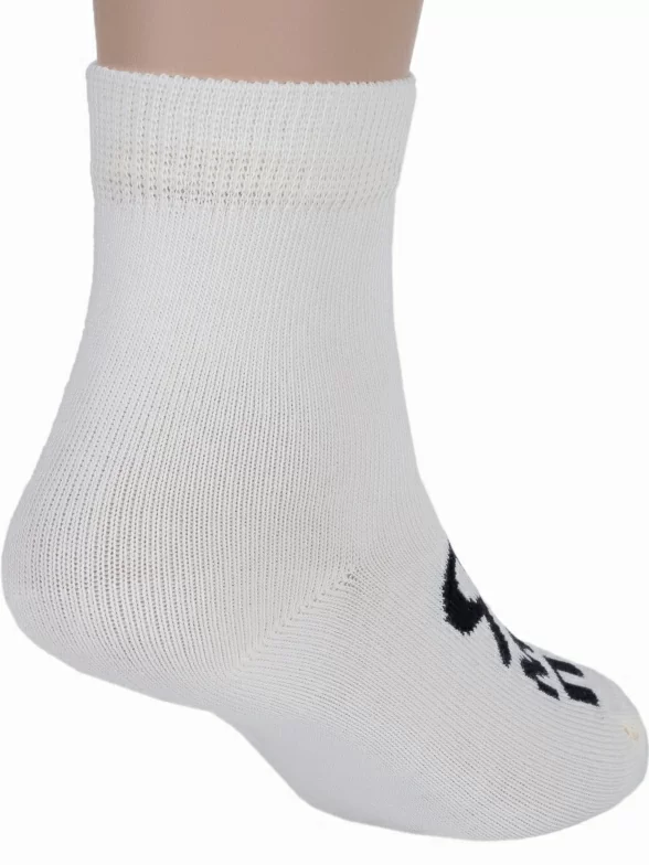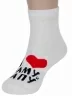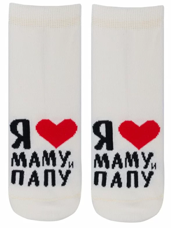 Круглогодичные укороченные детские носки, цвет кремовый, повседневные, шов кеттельный (бесшовная технология), принт (рисунок): сердечки / поцелуи / любовь, надписи, с узором, крупные контрастные рисунки, состав: 85% хлопок, 13% полиамид, 2% эластан, арт. Д-106/1. Производитель «ООО Орудьевский трикотаж, Россия» под брендом «Rusocks (орудьевский трикотаж)».