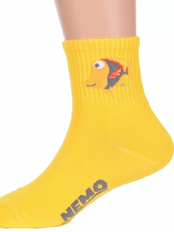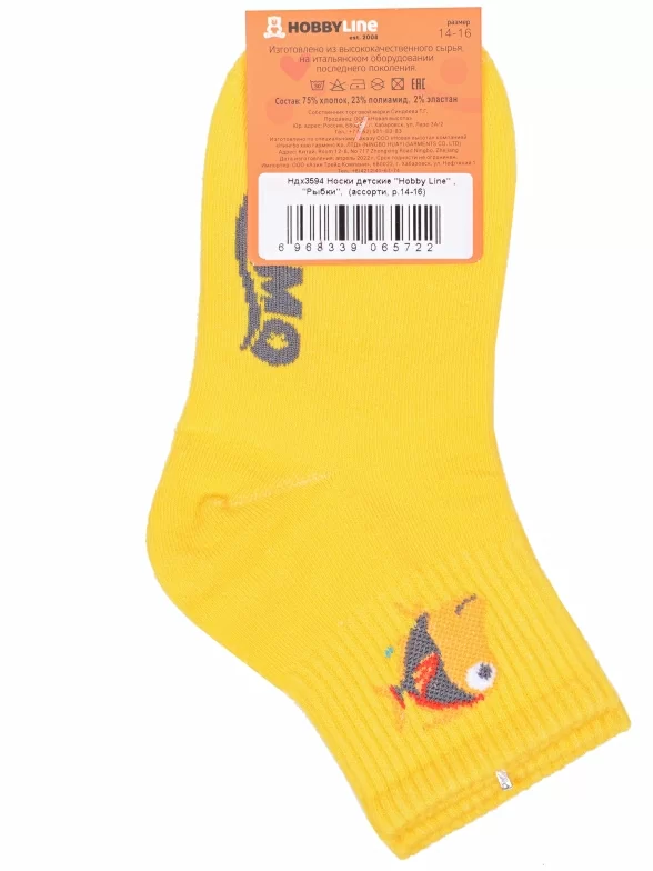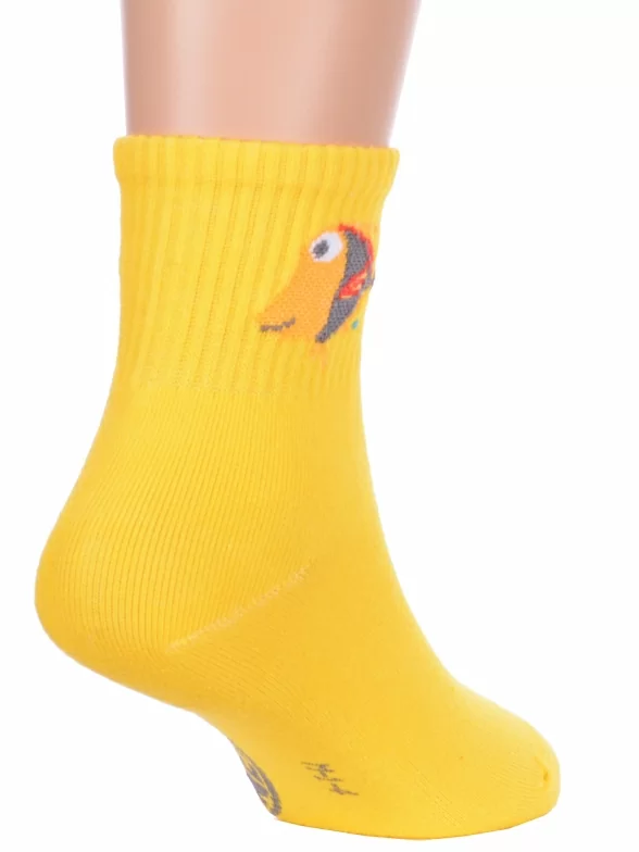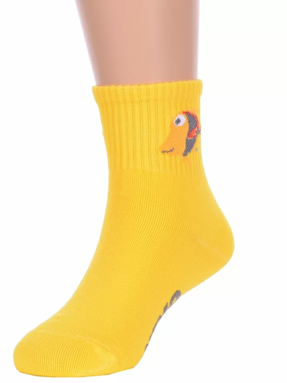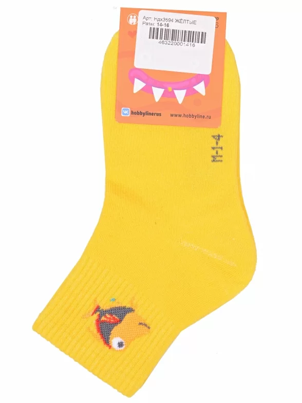 Круглогодичные укороченные детские носки, цвет желтый, спортивные, с вышивкой, шов обычный (не бесшовные), принт (рисунок): фильмы / сериалы / мультики, надписи, животные, с узором, состав: 75% хлопок, 23% полиамид, 2% эластан, арт. Ндх3594. Производитель «Китай, страна бренда - Россия» под брендом «Hobby line».