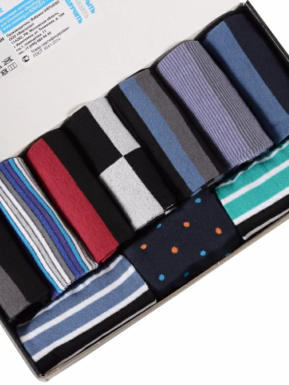 Носки компактно свернуты в аккуратные рулончики внутри стильной коробки. Для сохранности внешнего вида при транспортировке набор упаковывается в плотный картон.
