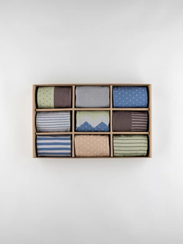 В этот набор входит 9 пар мужских носков с различными геометрическими принтами, которые подойдут для любого повседневного образа.