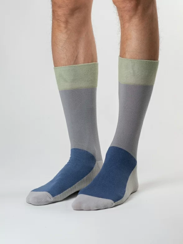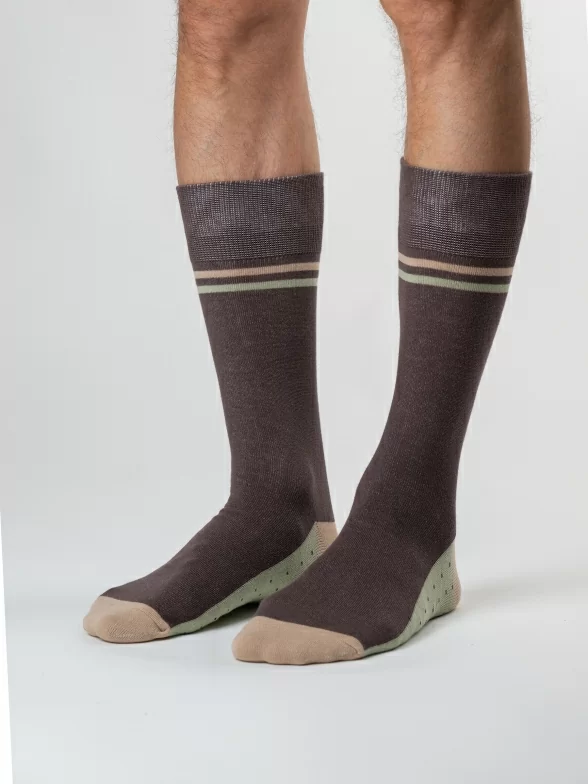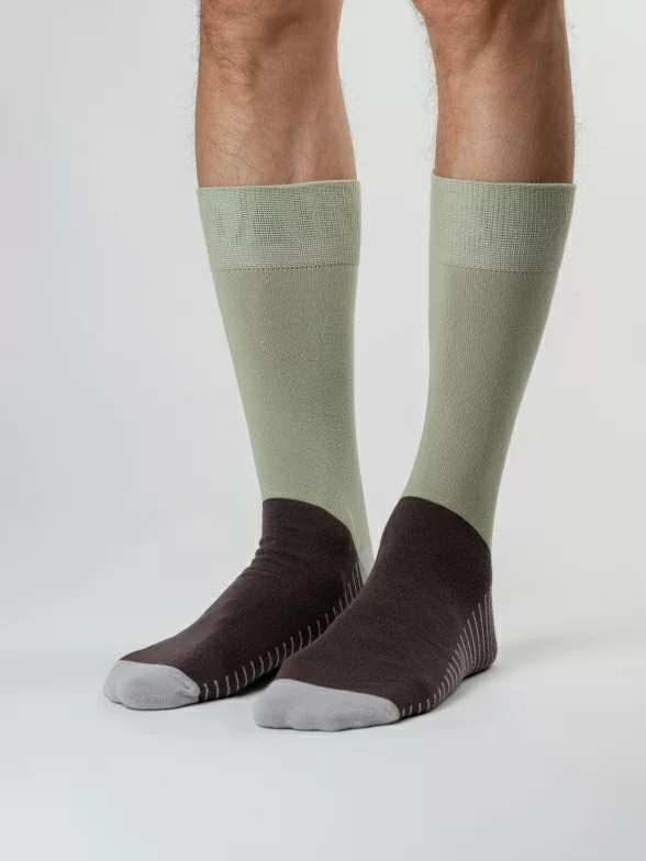 Носки вяжутся на российской фабрике на современных станках высокого класса (с плотностью вязки в 200 игл). Благодаря качественному оборудованию и оптимальному сочетанию гребенного хлопка и синтетических нитей эти носки износостойкие, гладкие и плотные. Двойной широкий борт не пережимает ногу, при этом надежно фиксирует носок на голени.