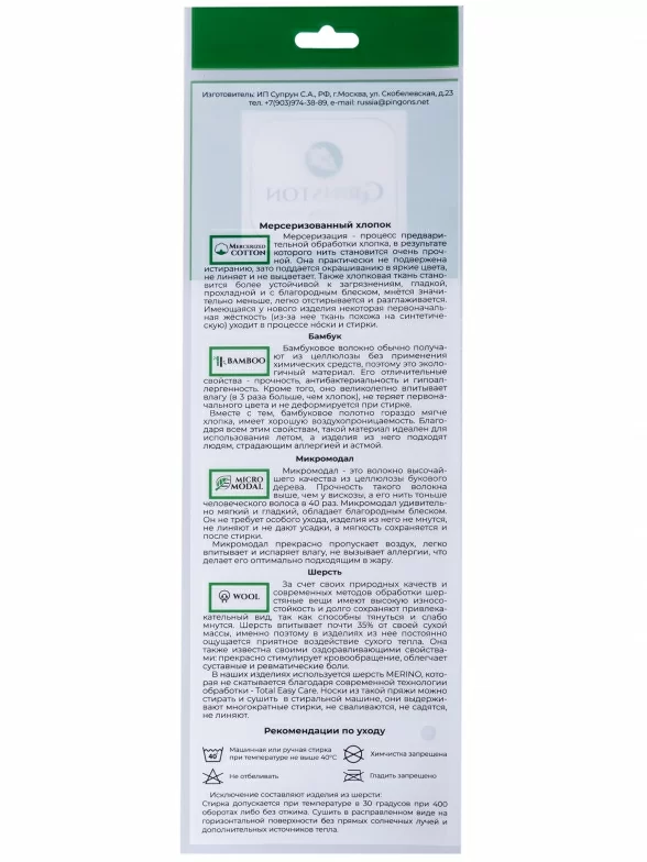 Связаны из бамбукового волокна, известного своей мягкой фактурой, но из-за которой износостойкость в носках не высока в сравнении с хлопком. Для ее повышения обязательно добавляются синтетические нити - в этом товаре полиамид. Из других преимуществ бамбука его гипоаллергенность и гигроскопичность (способность впитывать и испарять влагу), поэтому в таких носках будет комфортно не только в демисезонный период, но и в летнюю жару. Процентное соотношение волокон: 90% бамбук, 10% полиамид.